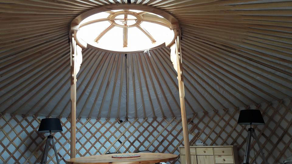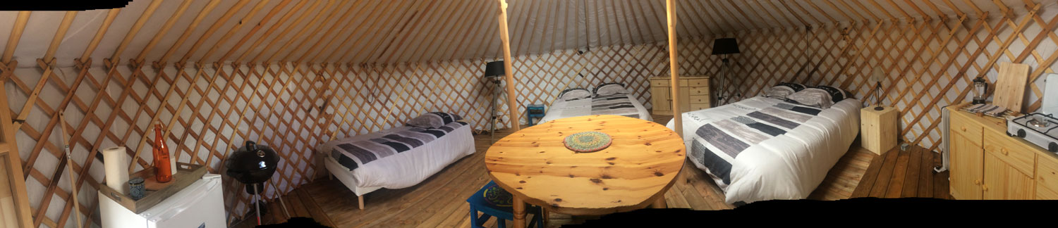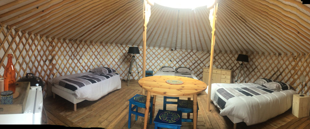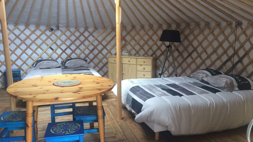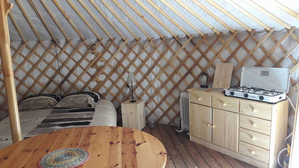7 Yourtes Mongoles : 28m2 (Diamètre 6,00m) pour 5 personnes équipée de 2 grands lits et 1 petit lit (avec couettes chaudes 400g/m2, coussins), table de cuisine, 5 tabourets, éclairage électrique, prises, penderie, range vêtements. Coin cuisine avec 3 feux gaz, vaisselle pour 5, réfrigérateur 110l, huile, vinaigre, sel, poivre, essuie-tout, torchon, essuie-main, .... Chauffage par radiateur électrique d'appoint 2000W (Vous n'aurez pas froid).